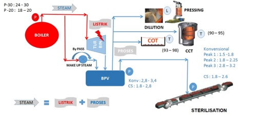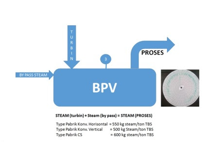 Jika Pabrik Konvensional kapasitas 60 ton TBS per jam. dimana kebutuhan rasio steam terhadap TBS adalah 0.55 (kg steam per ton TBS). Maka steam yang dibutuhkan untuk proses adalah 0.55 x 60 = 33 ton steam per jam.