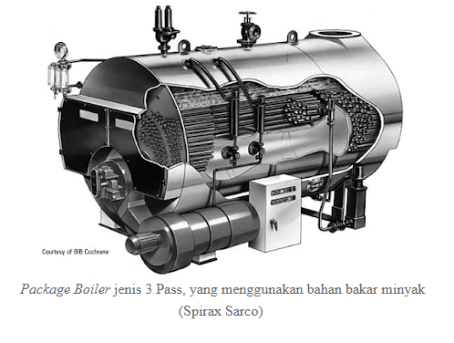 Package Boiler ini memiliki jenis dengan tipe shell dan tube dengan design rancang jenis fire tube yang memanfaatkan transfer panas baik radiasi maupun konveksi yang tinggi. Fire tube sendiri merupakan jenis, dimana api atau sumber panas mengalir pada pipa, kemudian pipa-pia tersebut memanaskan air pada drum. Boiler jenis ini biasanya dikelompokkan berdasarkan jumlah pass atau sectionnya – yaitu berapa kali gas pembakaran melintasi boiler. Ruang pembakaran atau furnace ditempatkan sebagai lintasan pertama kemudian setelah itu satu, dua, atau tiga set pipa api. Boiler yang paling umum pada industri Kelapa Sawit (Pelabuhan) adalah unit tiga pass/  lintasan dengan dua set fire-tube/ pipa api dan gas buangnya keluar dari belakang boiler.