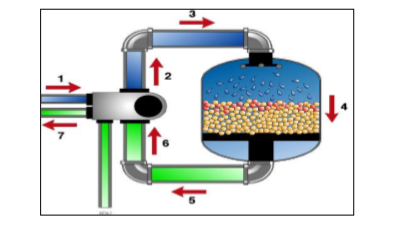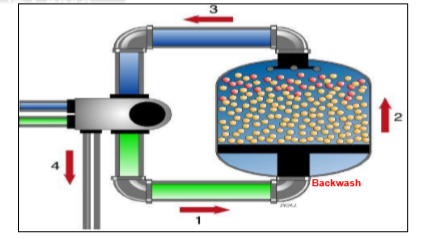 Aliran air dipaksa naik melalui lapisan resin untuk menghilangkan kotoran-kotoran yang terkumpul selama operasi (gbr 4.). Biasanya kotoran dan lumpur menempel pada resin yang mengakibatkan kemampun resin menurun. Dengan cara di backwash maka lumpur dan kotoran akan menghilang dan mengembalikan fungsi dari resin seperti semula.