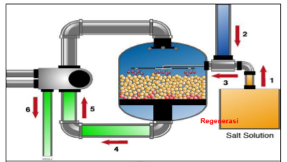 Aliran proses seperti gbr.5. Sewaktu regenerasi, larutan garam yang pekat mencuci permukaan resin untuk menaikkan kembali kapasitas penukar ion dari resin. Regenerasi terjadi dengan cara sodium dalam larutan garam menggantikan Ca dan Mg hardness pada resin penukar ion.