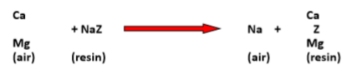 Air masuk melalui bagian atas softener dan mengalir melaluilapisan resin penukar ion. Tiap biji resin mempunyai banyak tempat di permukaannya dimana terjadi pertukaran Ca dan Mg hardness yang tidak diinginkan di dalam air.