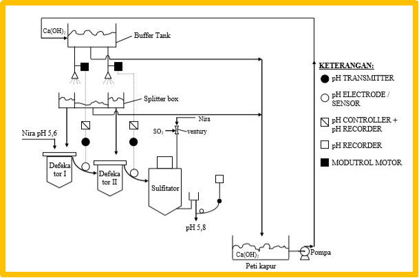 Pemberian emulsi kapur Ca(OH)2 dilakukan secara otomatis melalui unit pH control yang dihubungkan dengan splitter box. Splitter box adalah tempat pembagi emulsi kapur yaitu aliran ke defekator dan pengembalian kelebihan emulsi kapur. Di samping penggunaan pH control, pemberian emulsi kapur juga dapat dilakukan secara manual dengan menggunakan piring tetes. Indikator yang digunakan adalah BTB (brom thymol blue) dan PAN (phenol alpha naphtol) dengan hasil berwarna hijau kebiruan. Pada tahun giling 2001 seluruh reaktor dipasang unit pH meter secara otomatis.
